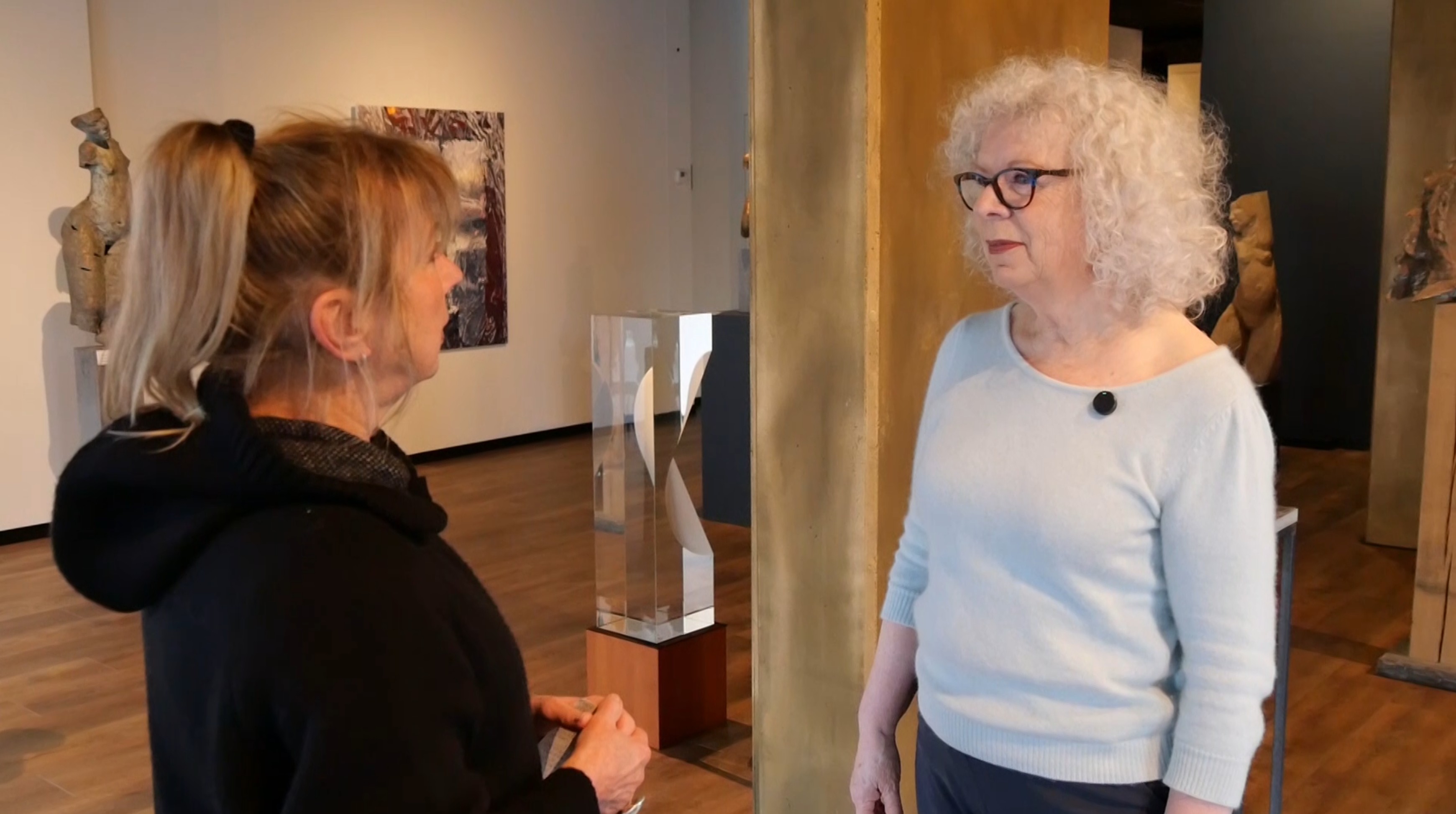 En dat lukt. Het plezier spat van de kunstwerken af en je komt ogen tekort om alles goed te zien. Wat direct opvalt is materiaal, formaat en expressie. Marie-Thérèse is niet bang voor groot werk, integendeel, zo maakt ze het 't liefst. In haar atelier is een bijzondere verzameling objecten te ontdekken: botten, stenen, een gigantische koeienkop en bungelende etalagebenen. Meerdere schildersezels staan naast elkaar, om simultaan te schilderen.